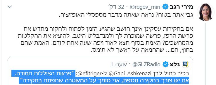שרת התחבורה מירי רגב לא נשארה חייבת והגיבה: "גבי אתה בטוח? נראה שאתה מדבר מספסלי האופזיציה. אם בחקירות עסקינן אינך חושב שהגיע הזמן לפתוח ולחקור מחדש את פרשת הרפז, פרשה שמוכרת לך ולמנדבליט היטב. להוציא את ההקלטות מהמחשכים? האמת בסוף תצא לאור ויפה שעה אחת קודם. האמת שחם בחוץ, חם… שהחמאה על ראשך לא תימס.", תקפה רגב.