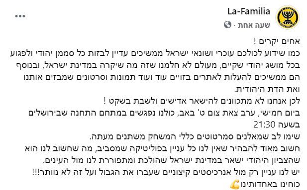 עוד נכתב בהודעת לה פאמליה: "לכן אנחנו לא מתכוונים להישאר אדישים ולשבת בשקט! ביום חמישי, ערב צאת צום ט' באב, כולנו נפגשים במתחם התחנה שבירושלים בשעה 21:30 שימו לב שמאלנים סמרטוטים כללי המשחק משתנים מעתה", נכתב בהודעה.
