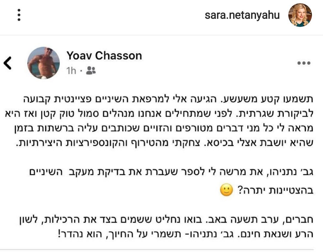 לאחר אין סוף שמועות ורכילויות על מצבה, הגברת שרה נתניהו מפרסמת פוסט של רופא השיניים אצלו ביקרה אמש: "תשמעו קטע משעשע. הגיעה אלי למרפאה פצייטנית קבועה לביקורת שגרתית. לפני שמתחילים אנחנו מנהלים סמול טוק קטן, ואז היא מראה לי כל מיני דברים מטורפים והזויים שכותבים עליה ברשתות בזמן שהיא יושבת אצלי בכסא. צחקתי מהטירוף והקונספירציות היצירתיות"