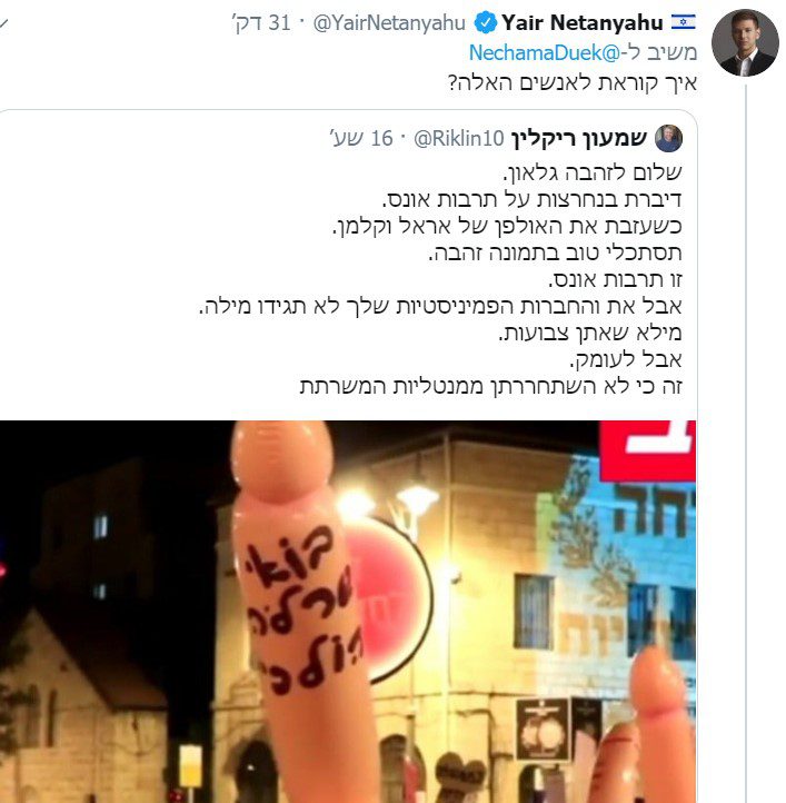 העיתונאי אביעד גליקמן צייץ בתדהמה "אולי יותר זמרי ונועם פתחי יוכלו לעזור לי?? קודם הופיע ציוץ של גלי ישראל על דבריו של יאיר נתניהו אצלכם בתוכנית על כך שהוא מראה לאבא שלו את התמונות של המפגינים ההזויים וראש הממשלה צוחק. משום מה אני כעת לא מוצא את הציוץ הזה. האם יכול להיות שהוא נמחק? יכולים לשלוח לי אותו?"