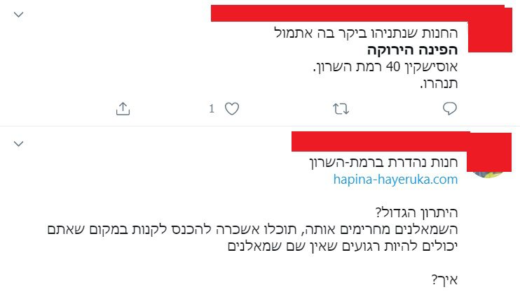 הגולש זיו כתב: "חנות נהדרת ברמת-השרון. היתרון הגדול? השמאלנים מחרימים אותה, תוכלו אשכרה להכנס לקנות במקום שאתם יכולים להיות רגועים שאין שם שמאלנים. איך?"
