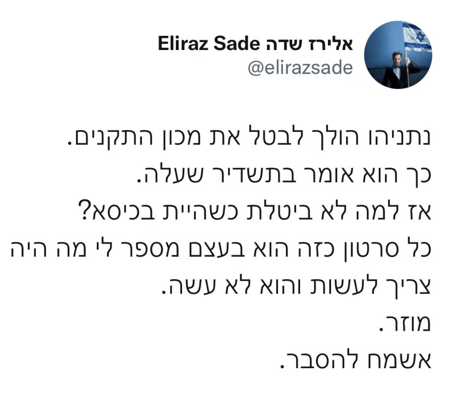 נתניהו הולך לבטל את מכון התקנים" פתח אלירז "אז למה לא ביטלת את זה כשהיית בכיסא?". שדה המשיך "כל סרטון הוא בעצם מספר לי מה היה צריך לעשות והוא לא עשה. מוזר" שדה סיים וכתב: "אשמח להסבר".