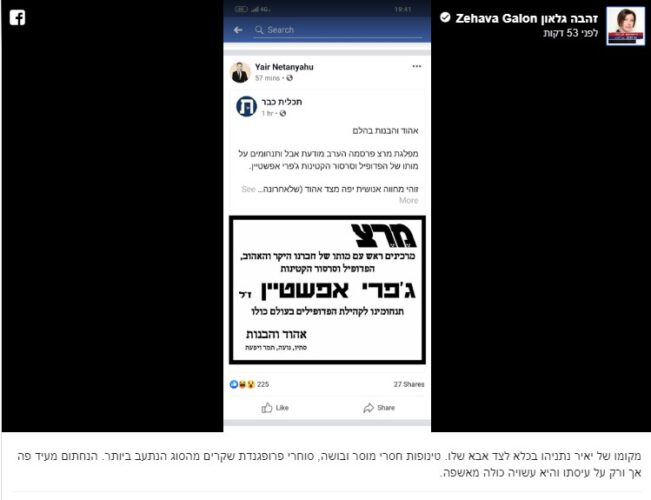 יו"ר מרצ לשעבר, זהבה גלאון, יוצאת במתקפה נגד יאיר נתניהו, בנו של ראש הממשלה נתניהו, ששיתף ברשתות החברתיות תמונה מפוברקת של מודעת אבל, שמפלגת מר"צ כביכול פרסמה על העבריין הפדופיל ג'פרי אפשטיין, שהתאבד הבוקר בתאו בכלא בארה"ב. וכך כותבת זהבה גלאון בזעם: "מקומו של יאיר נתניהו בכלא לצד אבא שלו. טינופות חסרי מוסר ובושה, סוחרי פרופגנדת שקרים מהסוג הנתעב ביותר. הנחתום מעיד פה אך ורק על עיסתו והיא עשויה כולה מאשפה."