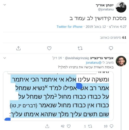נתניהו המלך: יועץ ראש הממשלה יונתן אוריך צייץ בטוויטר ציטוט מהגמרא שם כתוב "מלך שמחל על כבודו, אין כבודו מחול". עוד כתב ברמז עבה לעבר שקד וסמוטריץ': "האחרון בימין שהשתלח בראש הממשלה נתניהו גמר מתחת לאחוז החסימה"