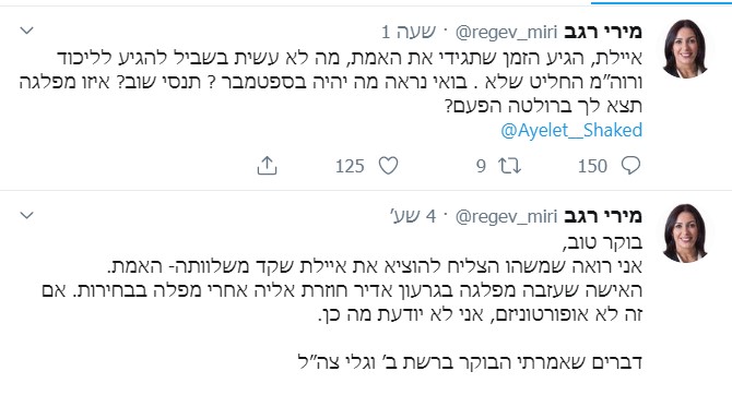 התגובה של השרה רגב לא איחרה לבוא: "בוקר טוב, אני רואה שמשהו הצליח להוציא את איילת שקד משלוותה- האמת. האישה שעזבה מפלגה בגרעון אדיר חוזרת אליה אחרי מפלה בבחירות. אם זה לא אופורטוניזם, אני לא יודעת מה כן. איילת, הגיע הזמן שתגידי את האמת, מה לא עשית בשביל להגיע לליכוד ורוה״מ החליט שלא . בואי נראה מה יהיה בספטמבר ? תנסי שוב? איזו מפלגה תצא לך ברולטה הפעם?", הגיבה השרה רגב בציוץ בטוויטר.