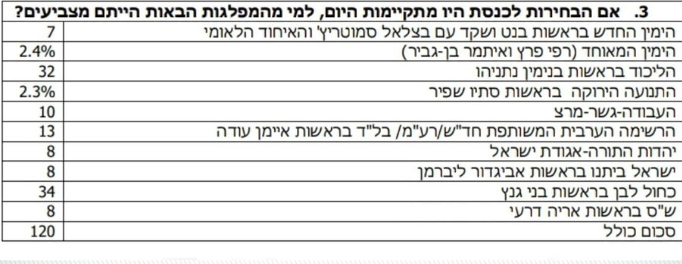 הסקר בוצע בתאריך ה- 14 בינואר 2020 בשעות אחר הצהריים, באמצעות מערכת דיגיטלית בקרב 574 נדגמים מאוכלוסייה הבוגרת (18+) היהודית והערבית בישראל תוך מתן משקלים מתאימים. טעות הדגימה הסטטיסטית 4.4%+- בהסתברות של 95%.