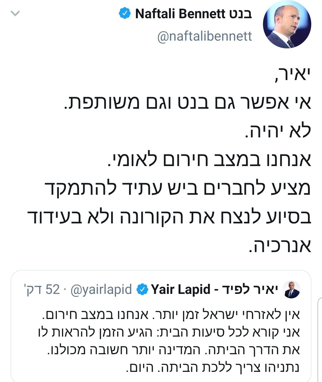 ח"כ נפתלי בנט הגיב ללפיד: "יאיר, אי אפשר גם בנט וגם משותפת. לא יהיה. אנחנו במצב חירום לאומי. מציע לחברים ביש עתיד להתמקד בסיוע לנצח את הקורונה ולא בעידוד אנרכיה.