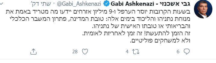 מפלגת 'כחול לבן' בראשון בני גנץ מפרסמים הודעה רגע לפני כינוס מסיבת העיתונאים של ראש הממשלה נתניהו: "קוראים לראש הממשלה להתעשת ולחזור לראות את טובת המדינה ולא את טובתו האישית. בזמן שתשעה מיליון אזרחים מצפים לאחדות וטיפול בביטחון ובקורונה, הליכוד עסוק בתרגילים פוליטיים. זו יריקה בפרצופם של אזרחי ישראל משיקולים אישיים."